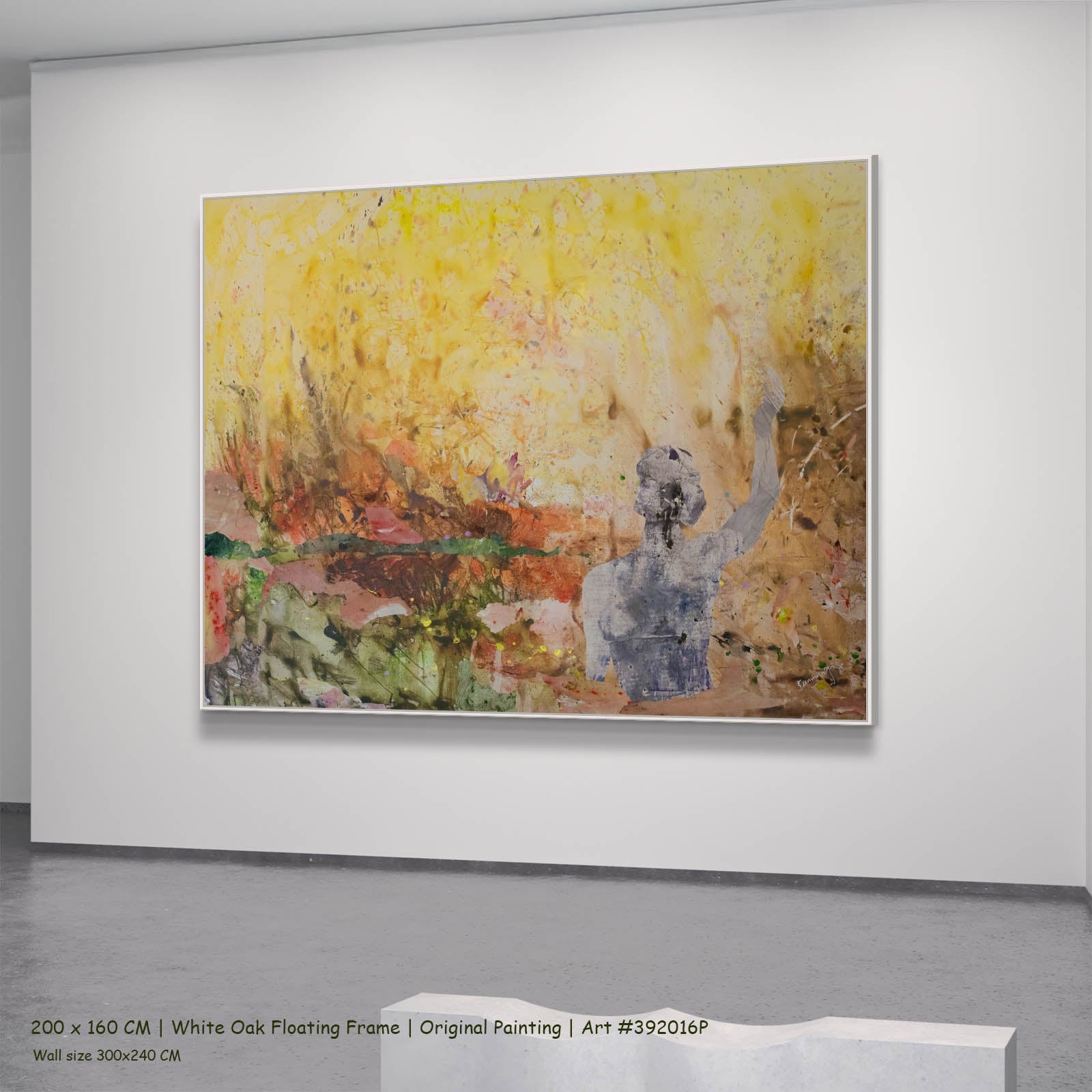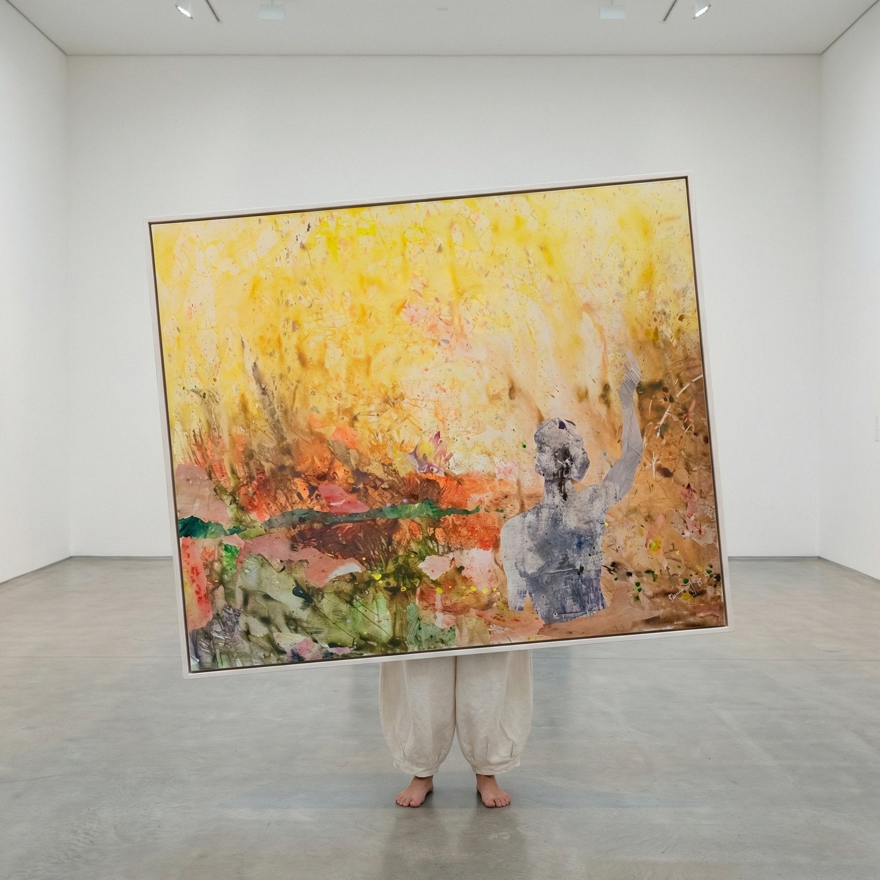 Mixed media on stretched canvas. Acrylic and ink with mineral and earth pigments, building translucent figure form through layered golden-yellow and earth-tone washes.