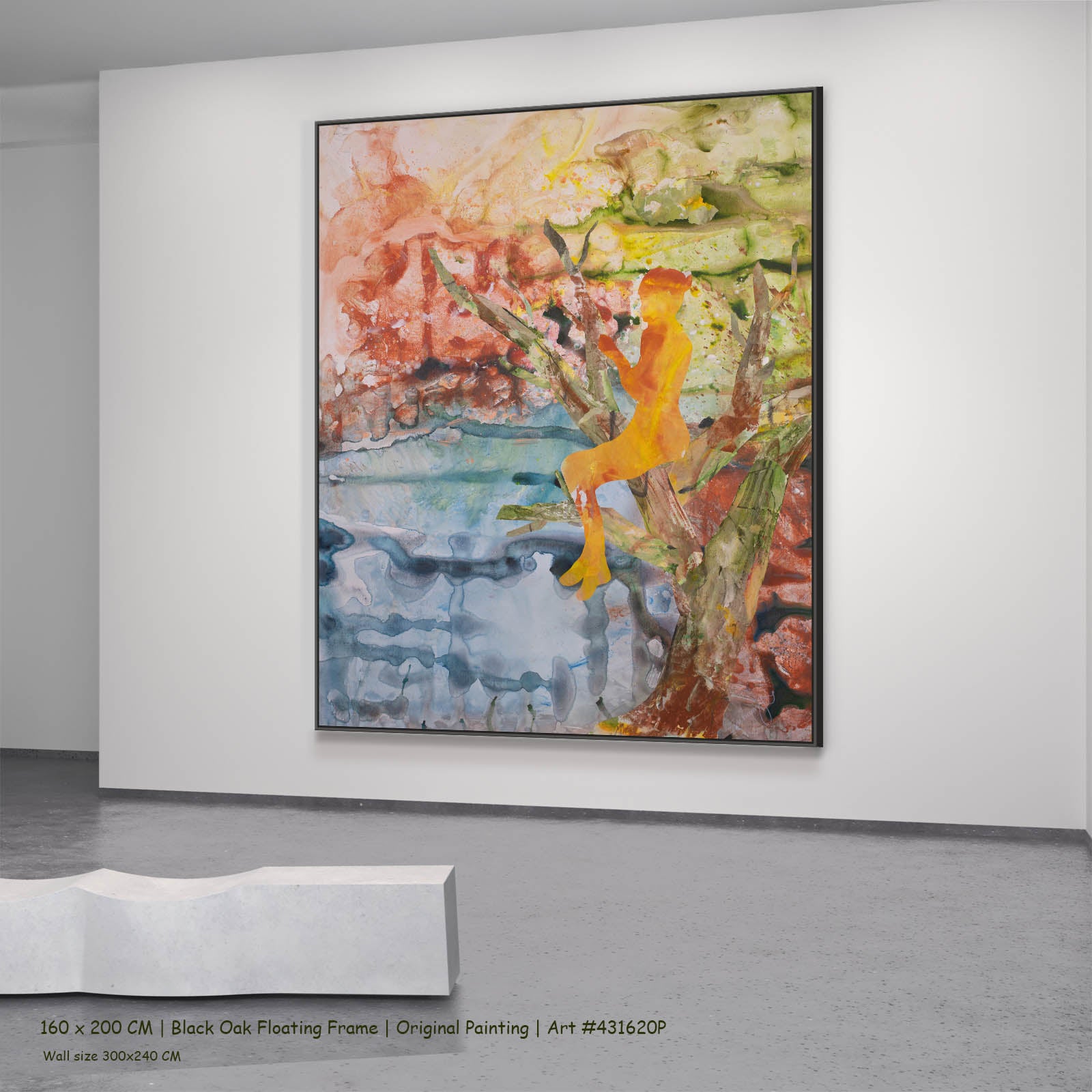 A golden-orange translucent figure sits in a tree beside grey-blue water, surrounded by red rock formations, green vegetation, and warm atmospheric light in a large-scale mixed media composition.