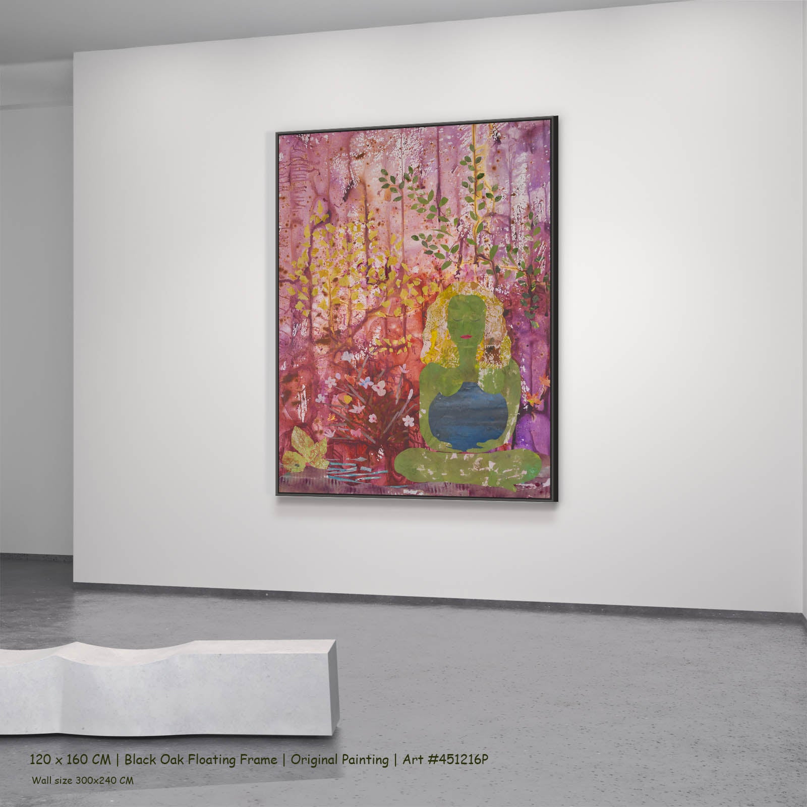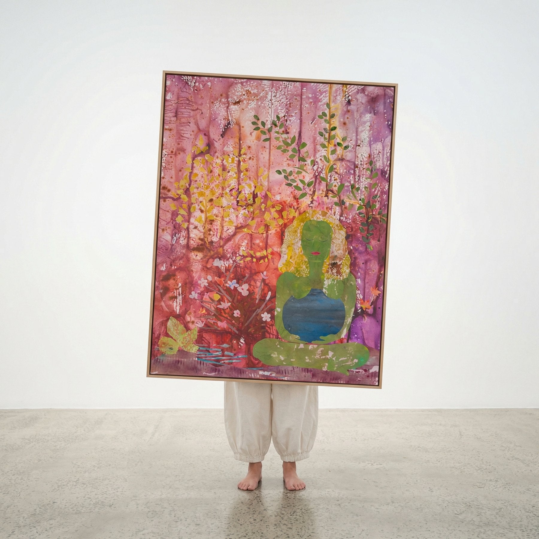 Mixed media on stretched canvas. Acrylic and ink with mineral pigments, layering green and pink-purple washes with leaf and flower motifs through the meditative figure form.